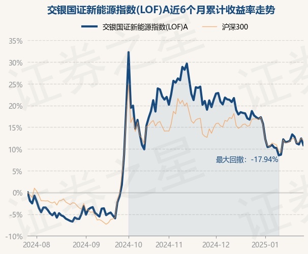 本站消息,1月27日,交银国证新能源指数(LOF)A最新单位净值为0.8896元,累计净值为0.9343元,较前一交易日下跌1.37%。历史数据显示该基金近1个月下跌5.18%,近3个月下跌10.54%,近6个月上涨10.87%,近1年上涨10.4%。该基金近6个月的累计收益率走势如下图: